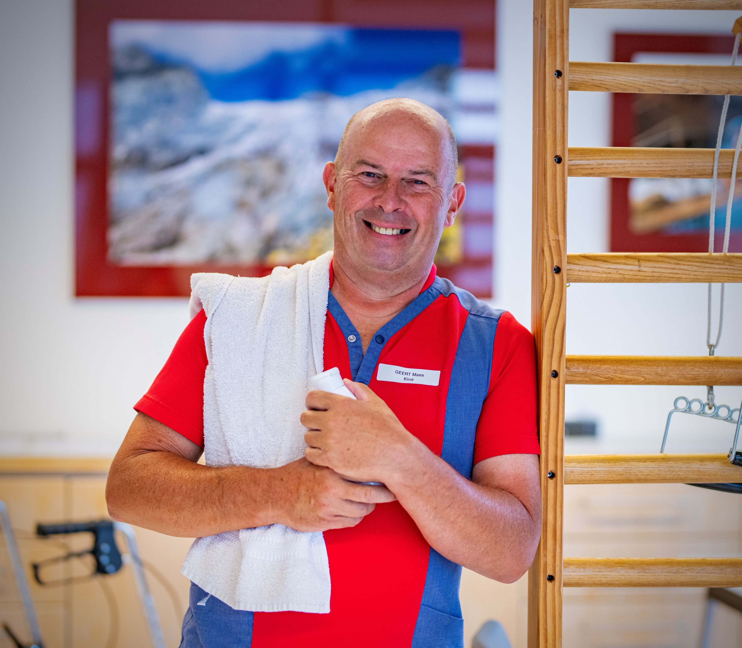 Geert: “Ik heb ook nog een eigen kinesistenpraktijk en net die afwisseling maakt het boeiend. Want hier in het woonzorgcentrum heb ik nog een heleboel collega’s en met hen samenwerken is een grote meerwaarde.”